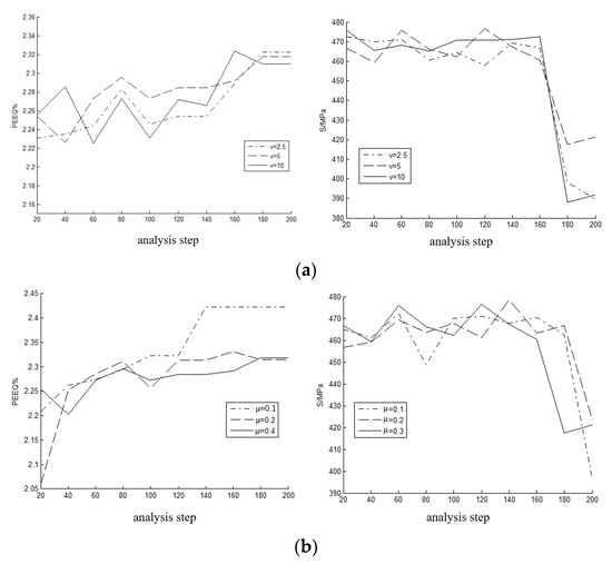 Influence of braking parameters on the strain/stress of scribe-type abrasive wear. (a) Strain/stress changes with different braking speeds. (b) Strain/stress changes with different friction coefficients.