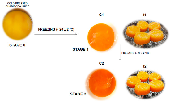 According to Canella et al. [20], the gravitational assisted block freeze concentration was performed. Figure 1 contains a schematic view of the process: the cold-pressed guabiroba juice (J) was fractionated in 200 mL plastic containers and then frozen at −20 ± 2 °C. After completely freezing the juice, 50% of the initial mass was defrosted at room temperature (20 ± 2 °C), obtaining two fractions at the first stage: the concentrated guabiroba juice (C1) and the ice fraction (I1). The defrosted liquid (C1) was used as a feed solution for the second stage, obtaining a second concentrated juice (C2) and ice (I2). For stage 1 of the freeze concentration process, the concentration factor (CF) and process efficiency (PE) were 1.6 and 76%, respectively. For stage 2, CF = 2.1 and PE = 58%, according to Aider and Ounis [21].