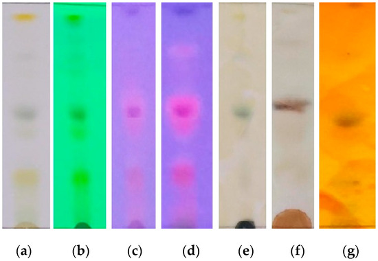 - Lopes, J.L.C. Cromatografia em Camada Delgada. In Fundamentos de Cromatografia; Collins, C.H., Braga, G.L., Bonato, P.S., Eds.; Editora da Unicamp: Campinas, Brazil, 2006; pp. 67–86. [Google Scholar]