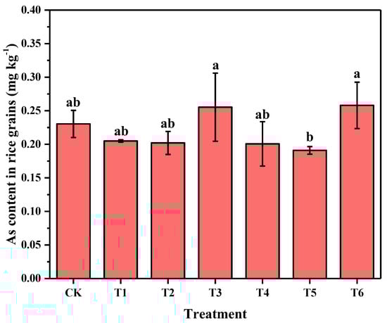 Content of As in rice grains in different treatments. (Note: the different letters a and b indicate significant differences at the 0.05 probability level).
