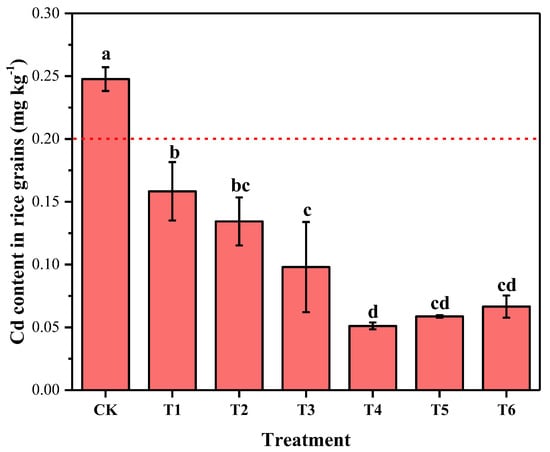 Content of Cd in rice grains in different treatments. (Note: the different letters a, b, c, and d indicate significant differences at the 0.05 probability level. The dashed line represents the threshold of rice grains in GB 2762-2017).