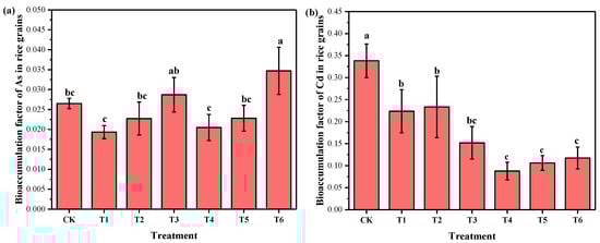 Bioaccumulation factors of As (a) and Cd (b) in rice grains under different treatments. (Note: the different letters a, b, and c indicate significant differences at the 0.05 probability level).