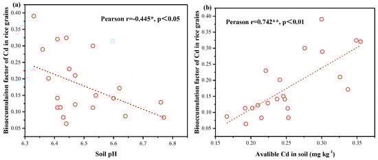 Correlation between soil properties and BCF of Cd in rice grains. (a) The relationship between soil pH and BCF of Cd in rice grains, (b) The relationship between soil available Cd and BCF of Cd in rice grains. The circles represent the BCF of the sample in different soil pH or available Cd content. The lines represent the linear fit curve. * and ** indicate the significantly correlation between soil properties and BCF at the 0.05 and 0.01 probability level, respectively.