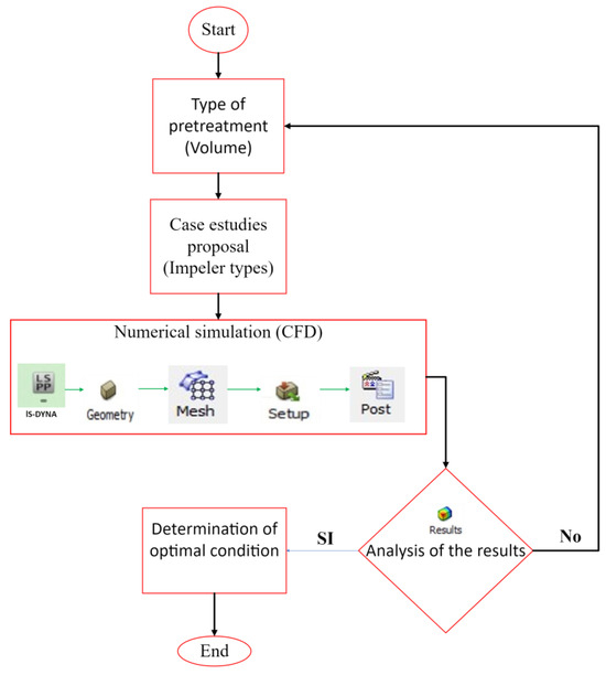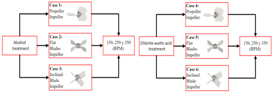 For this research, speeds of 150, 250, and 350 rpm were used. Three types of impellers were used (propeller, flat blades, and inclined blades). The computer program used is LS-DYNA. The viscosity and density used are that of alcohol and water, and the useful volume is 50 L. Two block diagrams are made for the two processes. The diagrams show how many study cases are addressed. Figure 2 shows the block diagrams for each treatment. In the process with alcohol, the stirring speeds of three types of impellers (propeller, flat blades, and inclined blades) are analyzed at three different speeds: 150 rpm, 250 rpm, and 350 rpm. The same is used for the process with chlorite–acetic acid.