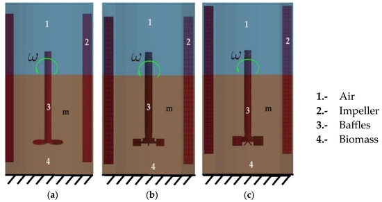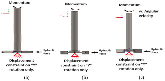 The agitator blades propel the biomass, generating plastic deformation in the impeller shaft. This article considers the stresses produced in the impeller caused by the biomass load. When the motor exerts a moment to drive the agitator, it generates a shear stress in the mixture. The motor torque is transmitted through the shaft to the impeller, and the loads on the agitators are generated by the movement of the driving fluid, and are then transmitted. Figure 4 illustrates the boundary conditions of the impellers (a) propeller, (b) flat blade and (c) inclined flat blade.