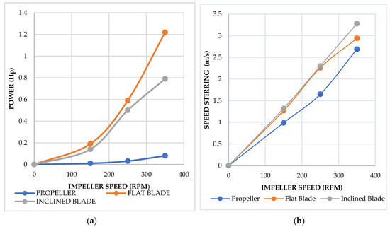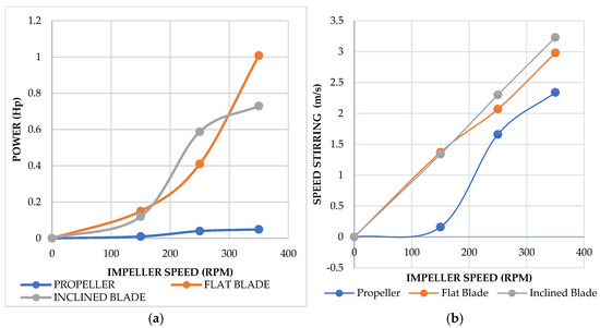 Figure 5a illustrates the “power vs. rpm” graph for case studies 1, 2, and 3. The propeller design had a lower power curve than the flat-blade and inclined-flat-blade impellers, due to its design and the angle of the propellers. The flat-blade-impeller design required more power to move the mixture, because the highest value in the Ppwer curve is observed at 350 rpm, which is 1 Hp. Finally, the inclined-flat-blade-impeller design had an intermediate curve compared to the other impellers. Figure 5b illustrates the “Speed stirring vs. rpm” graph. The graph shows that the inclined impeller is the one that reaches the highest stirring speed of 3.23 m/s, with the flat-blade impeller at the bottom and the propeller impeller at the bottom.