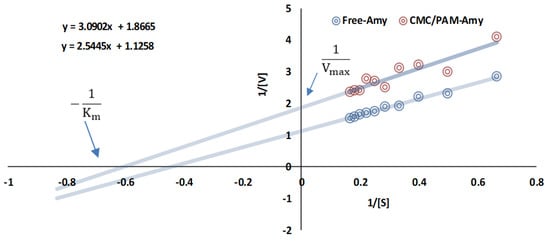 Lineweaver–Burk plot of free and immobilized amylase for varying substrate concentrations.