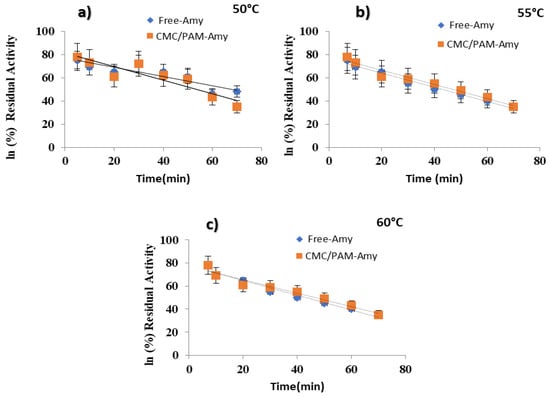 Pseudo first-order plots were drawn to examine the thermal denaturation of the immobilized enzyme and its free counterpart at various temperatures (Figure 3a–c). The figures indicate increased thermal stability of immobilized amylase in comparison to its free counterpart. Table 3 presents thermodynamic and kinetic parameters for both free and immobilized enzymes. The observed t1/2 value indicated that the thermostability of amylase was significantly improved after immobilization in comparison to its free form. Moreover, the greater ∆G* values shown in the table for the immobilized amylase suggested that more energy would be needed to cause denaturation after immobilization, emphasizing the improved thermal stability vested by the immobilization process. CMC/PAM-Amy revealed a half-life (t1/2) of 67.54, 57.49 and 39.43 min at 50, 55 and 60 °C, respectively, which is about 3.5-fold greater than free amylase under the same conditions of temperature. The enthalpy (ΔH*) shown by CMC/PAM-Amy was higher (60.612) than the enthalpy of free amylase (45.161) and remained persistent at all other temperatures. These findings highlighted the enhanced thermal stability of amylase after immobilization, making it more resistant to denaturation under higher temperatures. The greater energy demand needed for denaturation, as directed by the ∆G* values, underscores the enzyme’s heightened thermal stability after immobilization, which could be beneficial for numerous applications where higher temperatures are involved. The unique behavior of enzymes after immobilization can be attributed to their nature and their supporting matrices [30]. Similar to the present work, a prior study on gel immobilized with amylase exhibited increased activity that persisted after 70 min of incubation at 60 °C demonstrating its resistance to denaturation [31]. Another study also emphasized the promising approach of amylase after being immobilized in enhancing its catalytic activity, allowing it to work effectively at 60 °C [32]. Successful immobilization processes strengthen the enzymatic performance and show improved heat stability and accelerative temperature maxima, providing the basis of enzyme immobilization for numerous commercial applications.