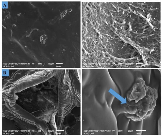 SEM images of CMC/PAM hydrogel (A) without incorporated amylase; (B) with incorporated amylase (Amylase incorporated on the surface of CMC/PAM hydrogel is shown by the arrow).