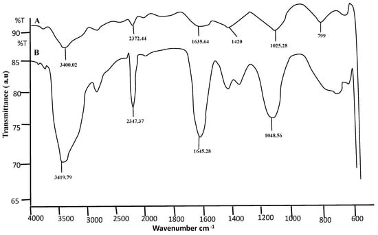 In order to investigate the surface functional groups on free and immobilized α-amylase, FT-IR spectra were obtained. Figure 6A presented the FTIR spectrum of the native hydrogel which revealed characteristic absorption bands conforming to various molecular vibrations and functional groups. A wide band was observed in a spectral range from 3500 to 3100 cm−1 representing the N-H vibrations in polyacrylamide gel. Our results were concurrent with the previous findings of FTIR studies who reported the presence of the same functional groups on PAM hydrogel [37]. The bands appearing at 1025 cm−1 and 799 cm−1 were attributed to the C–O–C stretching vibrations and C–H bending of the CMC backbone, respectively. The new peaks at 1420 and 1635 cm−1 in CMC hydrogel were attributed to –COOH bending and stretching, respectively [38]. The changes observed in the spectrum after immobilization of the enzyme shown in Figure 6B verified the presence of immobilized α-amylase. The clear peak between 2300 and 2400 cm−1 denotes a C-N bond which also verifies the attachment of amine functional groups [39]. The broad band appearing at 1645 cm−1 conforms to C––O stretching vibration (amide I). The covalent binding among α-amylase and CMC hydrogel led to an extensive intensity of the peak appearing at 1049.28 cm−1 which could be ascribed to the binding of α-amylase with the CMC hydrogel through intermolecular hydrogen bonds. The N-H vibrational stretching of the main amine were changed from 3401 to 3419.79 cm−1 in the spectra after α-amylase immobilization. Our findings are consistent with the findings of another study which reported that the appearance of a new peak at 1645.28 cm−1 verified the effective immobilization of α-amylase to the supportive matrix [40].
