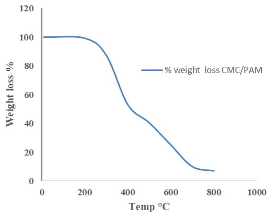Figure 7 shows the thermal behavior of the control hydrogel investigated through thermogravimetric analysis (TGA). The TGA curve revealed the loss of initial mass in the temperature range of 150–250 °C, which depicted a good complexation among the CMC and PAM networks. CMC/PAM gel degrades more than PAM-only gels at a temperature between 310 and 380 °C, which confirms the decomposition of the cellulose backbone in it as CMC bears COO− groups which are decarboxylated at this temperature range. The rise in thermal stability at temperatures between 220 and 400 °C might be attributed to the presence of the crosslinking agent. Additionally, a 50% loss of weight of CMC/PAM was detected at 408 °C. It was observed that the thermal stability was increased by the formation of the PAM/CMC hybrid hydrogel. Furthermore, the melting temperature (Tm) of the CMC/PAM gel was observed at 300.5 °C [41].