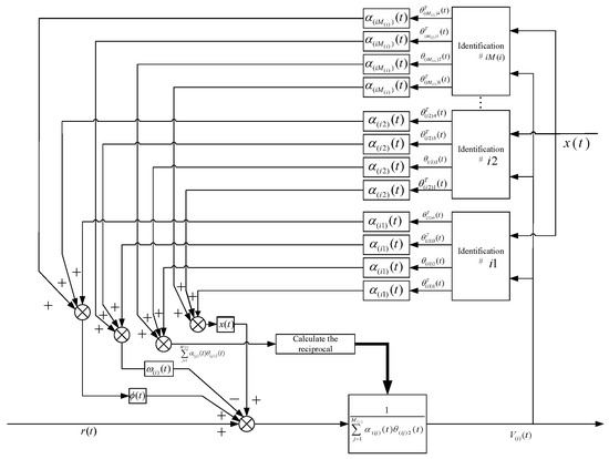 The framework of a multiple-model second-level adaptive failure compensation scheme for high-speed trains with unknown actuator failures is shown in Figure 1, which combines a second-level adaptive failure compensation controller set and a switching mechanism. The multiple-model second-level adaptive failure compensation scheme designs the corresponding adaptive controller for each possible failure pattern and constitutes a set of candidate controllers. Then, the optimal controller is selected by designing the control signal selection mechanism. The detailed structure of a second-level adaptive failure compensation controller under a certain failure pattern is shown in Figure 2. It can be seen from Figure 2 that the controller is mainly composed of four parts: multiple adaptive identification models, multiple convex combination coefficients , known basic function vectors , , and related input signals , . Its structural principle is mainly to weight and fuse the identification parameters of multiple adaptive identification models through convex combination coefficients and then obtain the corresponding multiple-model second-level adaptive controller parameters. Then, according to the designed controller mathematical model, the weighted controller parameters are combined with the known basic function vectors or related input signals, and each part is combined through the operator. Finally, the multiple-model second-level adaptive fault compensation controller with a certain failure pattern designed in this paper is constructed. It should be noted that the structure of every controller in the controller set is the same as the structure shown in Figure 2. Based on Figure 1 and Figure 2, the overall procedures of our design include following steps.