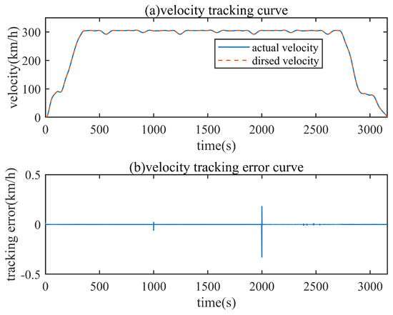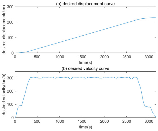 The desired speed and displacement curve selected in this paper is a real operation curve of the CRH380A-type high-speed train from the Jinan section to the Xuzhou section, which is shown in Figure 3. There are three working conditions of traction, uniform speed and braking in the process of train operation, and 0–350 s is the traction acceleration stage, 350–2700 s is the uniform speed operation stage, and 2700–3160 s is the braking stage. The total operating time of the journey is 3160 s, the operating mileage is 228 km and the maximum operating speed is 310 km/h.