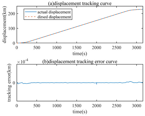 With the simulation conditions in Section 5.2, the results obtained from the simulation study are shown in Figure 4, Figure 5 and Figure 6. Figure 4 and Figure 5 are the control performance in terms of displacement tracking and speed tracking over different phases with the proposed control scheme. It can be seen that the multiple-model second level adaptive failure compensation control strategy of the high-speed train designed in this paper has the desired tracking control performance. When the actuator has an unknown failure, it can still achieve a better control effect. The speed and displacement tracking curves closely fit the target curve, the transient response is good, and it can converge quickly when the actuator has unknown failure. The transient error is controlled within 0.4 km/h, which is lower than 1% of the average speed, and it can meet the tracking accuracy and stability requirements of the high-speed train speed tracking control system. Figure 6 shows the controller switching information. It can be seen from the diagram that the controller switching strategy designed in this paper can accurately select the correct controller to control the high-speed train. When a failure occurs, the correct failure compensation controller can be switched within 1 s to compensate for the unknown failure. The simulation results show that the multiple-model second-level adaptive failure compensation controller designed in this paper has the expected failure compensation ability and can ensure the safe operation of the train.