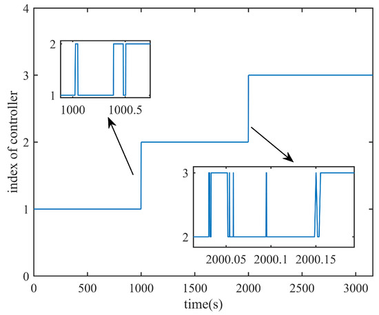 It is noted that switching between different controllers does not lead to bad effects on the system stability. When the current controller changes from to , , there is an additional item in the identification model , that is