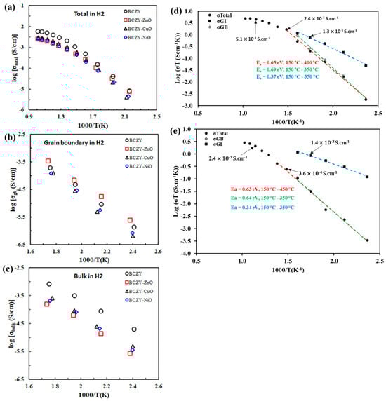 | Parameter (mS·cm−1) | BZY10 | BZY10 + 1% Co | BZY10 + 2% Co | BZY10 + 1% Ni | BZY10 + 2% Ni | BCZY27 | BCZY27 + 1% Co | BCZY27 + 2% Co | BCZY27 + 1% Ni | BCZY27 + 2% Ni |