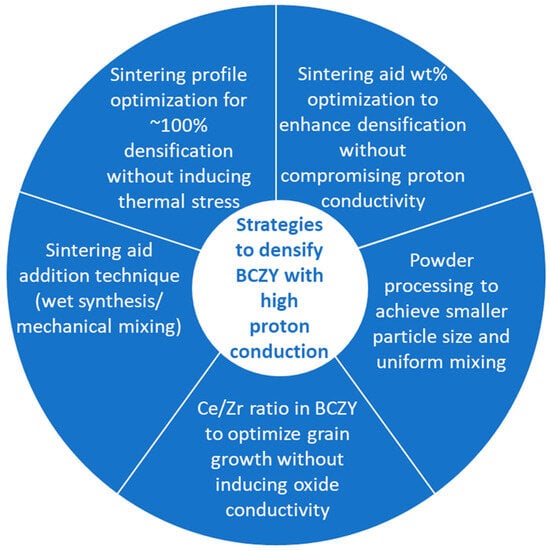 - Viechineski, F.N.; Ramos, K.; Chinelatto, A.L.; Chinelatto, A.S.A. Optimizing the densification of BaCe0.2Zr0.7Y0.1O3−δ proton conducting electrolyte using Fe2O3, Mn2O3 and ZnO sintering aids. J. Mater. Sci. Mater. Electron. 2023, 34, 2165. [Google Scholar] [CrossRef]