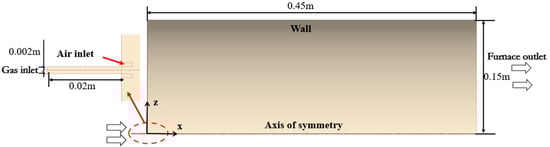 A simplified representation of the gas boiler structure was adopted, focusing on a half-axisymmetric model of the cylindrical combustion chamber for 3D simulation, as shown in Figure 1. The fuel is introduced through the central nozzle of the burner, which has a length of 0.02 m and a diameter of 0.002 m. The surrounding annular region supplies the secondary gas, which mixes with the methane fuel before combustion occurs. The main geometry parameters are listed in Table 1.