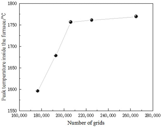 CFD commercial software was utilized for meshing the burner (Figure 2). To predict the combustion characteristics more accurately inside the boiler, local mesh refinement was applied at the fuel and air inlets, while boundary layer meshing was implemented along the furnace walls. Coarser mesh was used in other regions to optimize computational efficiency. The computational domain was discretized and analyzed for grid independence. The following five grid cell counts were considered: 176,393, 192,761, 206,351, 225,127, and 262,090. The grid independence verification results are shown in Figure 3. When the number of cells was increased to 206,351, the average temperature at the furnace outlet remained essentially constant, indicating grid independence. Therefore, to balance computational efficiency and accuracy, 206,351 cells were chosen for the final calculation.