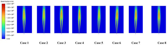 In the combustion study, the combustion reaction zone contained a large amount of OH radicals. The OH radical density can be used to characterize the flame reaction zone and its reaction characteristics, which can subsequently be used to diagnose the combustion effect [24]. The distribution of the OH radical mass fraction under different humidity ratios of air is shown in Figure 5. The concentration of OH radicals in the formation zone increased gradually with the humidity ratio of air. This was observed because the reaction in which water vapor is mainly involved generates a larger amount of OH radicals (Equations (2) and (3)) with increasing humidity ratio of air, which affects the consumption of OH, thereby increasing the concentration of OH inside the boiler.