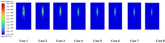 Current research on boiler emission pollutants indicates that approximately 90% of the NOx produced in turbulent jet flames is in the form of NO [25,26,27,28]. Figure 6 illustrates the thermal NOx generation rate at various humidity ratios of air. The generation rate of thermal NOx in the high-temperature zone at the center of the combustion flame decreased as the moisture content in the air increased. In Case 1, where the air had the lowest humidity ratio, the center of the combustion flame exhibited the darkest regions, indicating the highest thermal NOx generation rate. This stratification in NOx generation occurred because the combustion temperature in the furnace reached levels that promote thermal NOx formation. At a humidity ratio of 7 g/kg dry air, the peak NOx generation rate in the furnace chamber was . However, as the humidity ratio increased to 150 g/kg dry air, the maximum NOx generation rate dropped to . This confirms that the NOx generation rate decreases as the air’s moisture content increases, likely due to the cooling effect of water vapor, which reduces the peak combustion temperatures that drive thermal NOx formation.