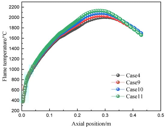 Temperature is a key indicator of the combustion process within the furnace chamber [23]. Figure 4 presents the combustion temperature distribution at various air humidity ratios. Although the overall characteristics of the temperature distribution remained similar across the different humidity levels, the high-temperature region was consistently concentrated near the central axis of the furnace chamber. As the humidity ratio increased, the temperature in this high-temperature region gradually decreased. For instance, at a humidity ratio of 7 g/kg dry air, the highest combustion temperature reached 1756 K, while the furnace outlet temperature was 1388 K (Figure 4). When the humidity ratio increased to 150 g/kg dry air, the peak combustion temperature dropped to 1689 K, with the outlet temperature decreasing to 1266 K. The overall temperature reduction from Case 1 to Case 8 was 3.8%. This reduction is attributed to the heat absorbed by the water vapor during evaporation, as water vapor has a higher specific heat capacity compared to oxygen and nitrogen. Consequently, humidifying the air lowers the central flame temperature, which indirectly reduces the intensity of the chemical reactions within the furnace chamber.