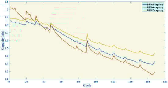 The cyclic aging experiment first makes the battery voltage reach charging cut-off voltage in CC charging mode, and then continues to charge in CV charging mode until the charging current drops to 20 mA before completing the charging test. The discharge test is conducted in CC discharge mode until the discharge cut-off voltage of the battery is reached. This study used batteries B0005, B0006, and B0007 as the research objects, and the fundamental specifications and experimental conditions of each battery are shown in Table 2. The variation in battery capacity with the number of cycles is shown in Figure 1, which indicates that as the number of cycles increases, the LIB’s capacity of will gradually decrease. In addition, if the discharge cut-off voltage is too small, it will accelerate the aging rate of the battery. Therefore, it is significant to control the discharge voltage of LIB reasonably to avoid the occurrence of over-discharge phenomenon for the healthy operation during the actual operation.