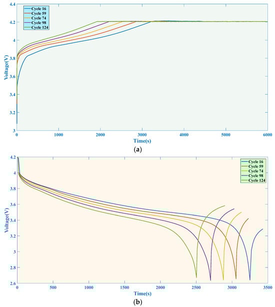 Charging and discharging curves of battery: (a) charging voltage curve and (b) discharging voltage curve.