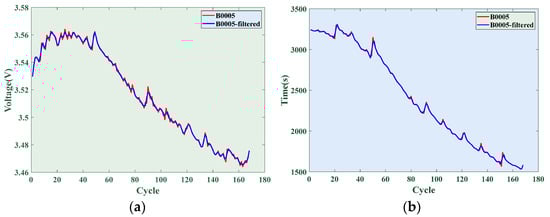 Due to the limitations of internal factors in batteries, measurement accuracy of voltage and current sensors, and external factors such as testing environment, there is a large quantity of outlier data in the extracted health features, which can lead to errors in SOH estimation. To eliminate the adverse effects of noise data, the Savitzky–Golay filter method is applied to filter the extracted six types of features []; it is a filtering method based on local polynomials that uses moving windows for least squares fitting, and the principle is as follows: