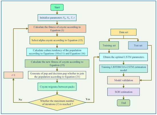 In summary, LRFDBCOA method proposed in this study replaces the selection strategy based on fitness values in COA method with FDB selection strategy, i.e., substituting Equation (11) into Equation (16) to rank coyotes based on total scores and using Lévy roulette strategy to replace the birth model of offspring in the population, i.e., replacing Equation (9) with Equation (21) []. The flowchart of LRFDBCOA is shown in Figure 4.