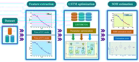Due to the increasing depletion of fossil fuels such as oil, coal, and natural gas [,], as well as significant progress in global science and technology, and the gradual popularization of green environmental protection [,] and low-carbon energy-saving concepts [,], electric vehicles (EVs), of which the power battery is the core component [,], have been vigorously promoted and developed rapidly. Lithium-ion batteries (LIBs) are widely applied as the power battery for EVs because of their high energy density, high power density, long cycle life, low self-discharge rate, and high output voltage [,]. During the operation of LIBs, the battery management system (BMS) plays a key role in monitoring and protecting the battery. Thereinto, accurate estimation of battery health status is one of the pivotal functions of a BMS []. State of health (SOH) is an important indicator for measuring the ratio of current performance to initial performance of a battery and is crucial for battery-based electric mobility technology. The SOH of batteries affects the endurance and safety of electric vehicles. Accurately monitoring SOH can help prevent accidental failures, extend battery life, enhance the user experience, and promote the sustainable development of electric mobility technology. Also, SOH characterizes the aging of a battery, from which an estimation is used to predict the remaining charge and discharge cycle of batteries. Consequently, accurate SOH estimation is of remarkable significance for the healthy and stable operation of subsequent LIBs.