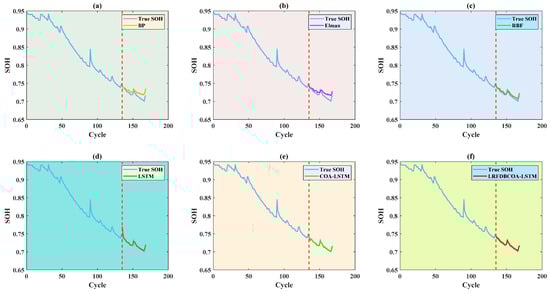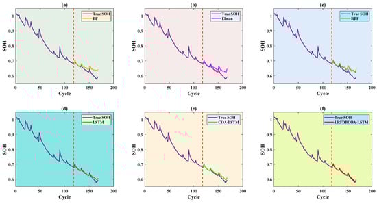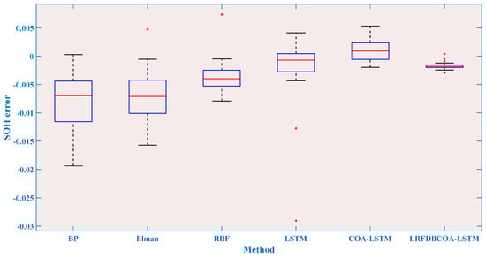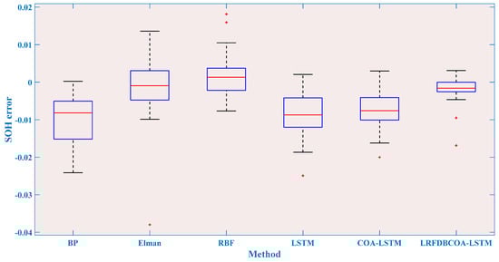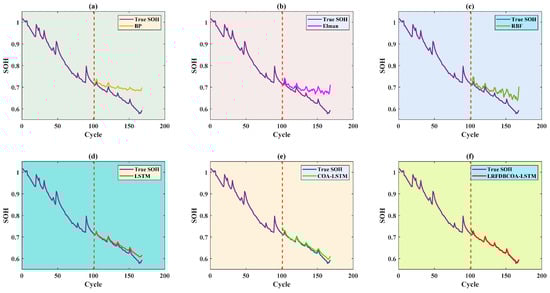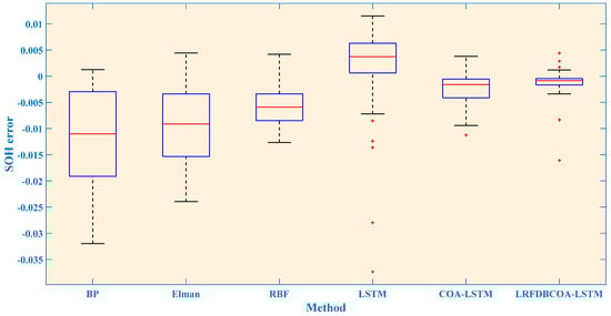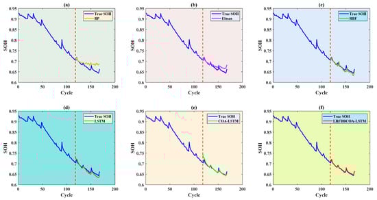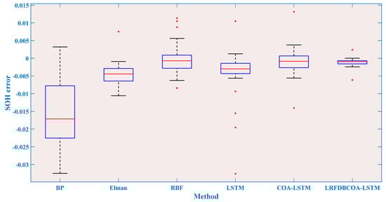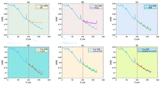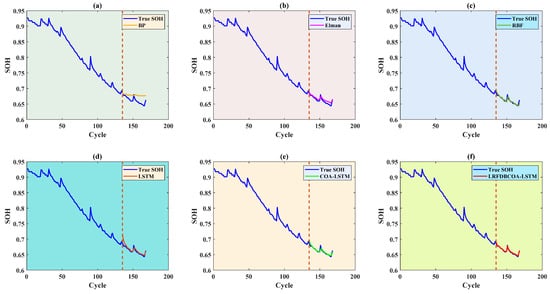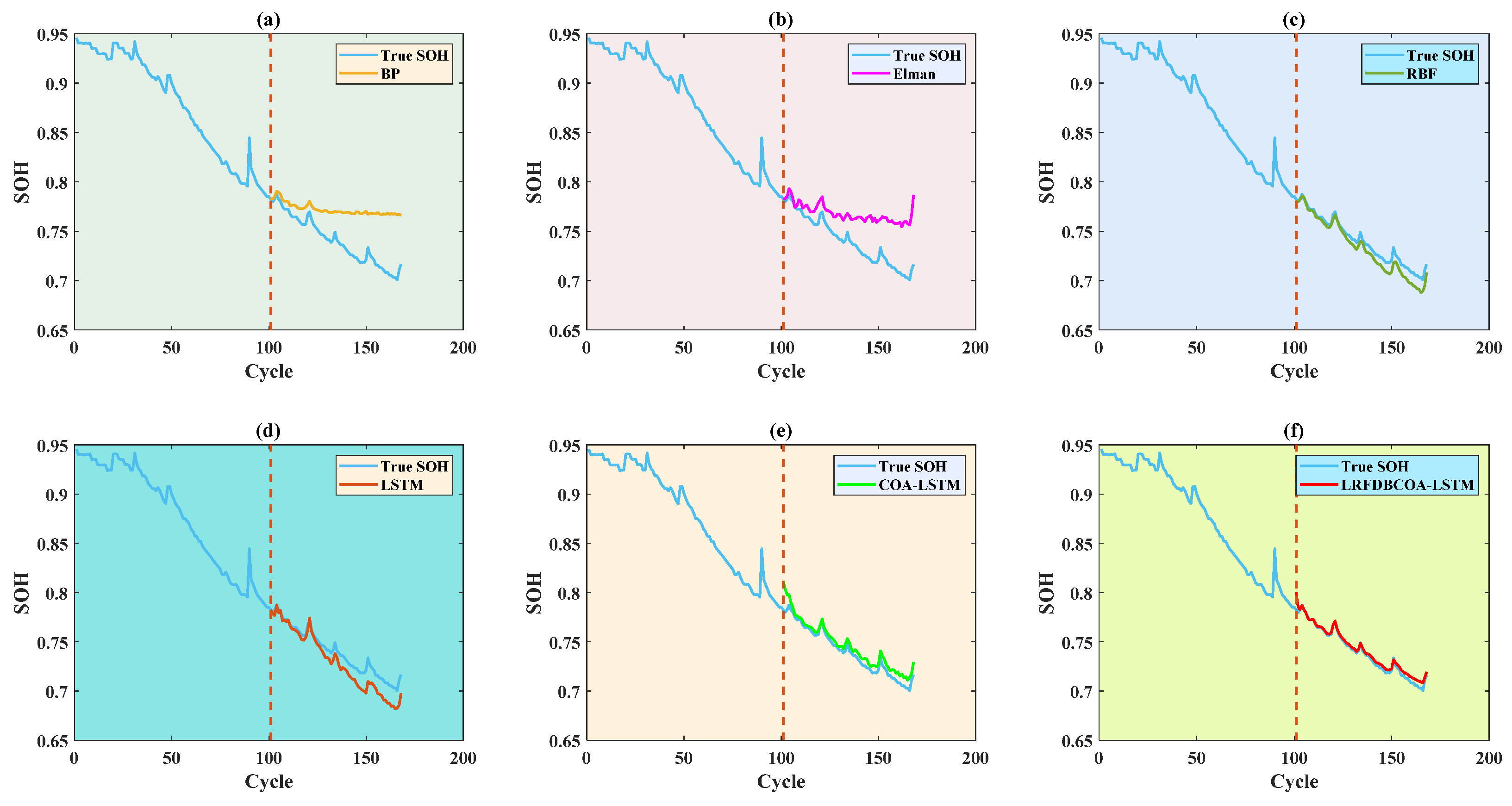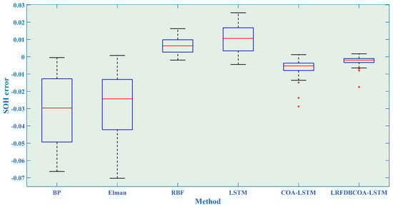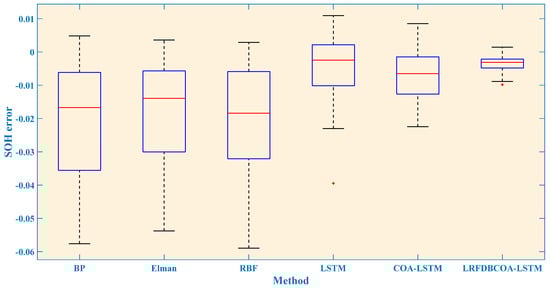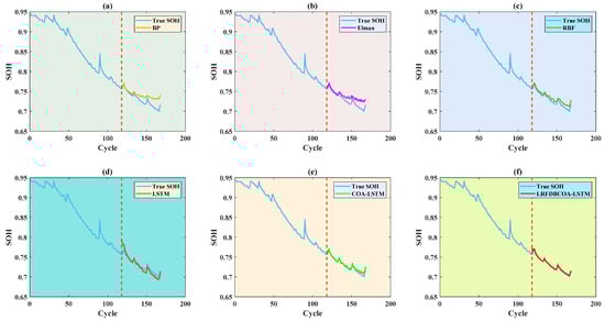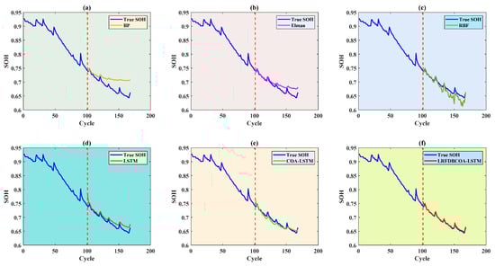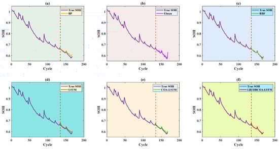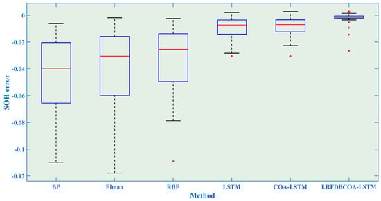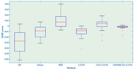 To verify the effectiveness, SOH experiments were conducted of the six methods under five evaluation criteria. The results highlight that LRFDBCOA-LSTM has the best estimation performance among the six methods. Furthermore, the accuracy of LRFDBCOA-LSTM is greatly improved compared to COA-LSTM and LSTM. In particular, the maximum enhancement in R2 compared to LSTM is 36.03%, and the maximum enhancement compared to COA-LSTM is 18.21%.