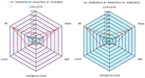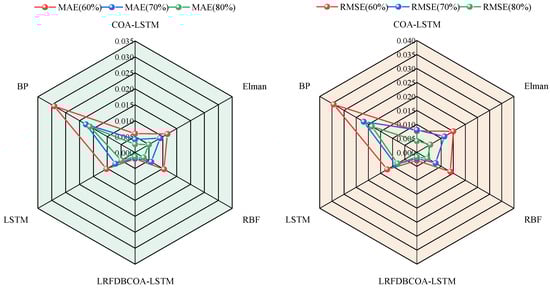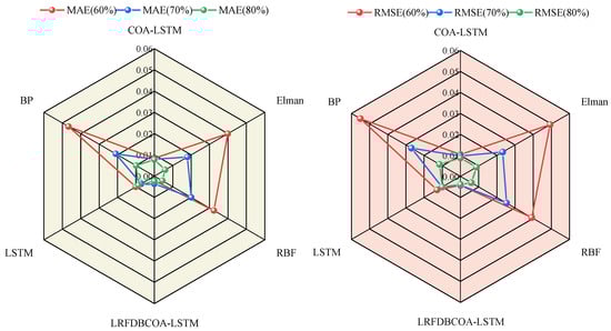 Based on the above results, it can be observed that LRFDBCOA-LSTM obtains the closest SOH estimation result to the original SOH degradation curve, with the smallest error and the highest accuracy compared to the other five algorithms. Meanwhile, the experimental results of LRFDBCOA-LSTM are superior to those of COA-LSTM and LSTM, which adequately demonstrates the algorithm improvement and neural network parameter optimization strategies applied in this work that can improve the performance of estimation in the model. In addition, LRFDBCOA-LSTM achieved excellent precision for SOH research on battery datasets under three different testing conditions, which indicates that the improved model has great generalization and robustness. Nevertheless, to test the influence of data size, the verification model is established based on different estimation starting points. However, this work also has some limitations, as follows: