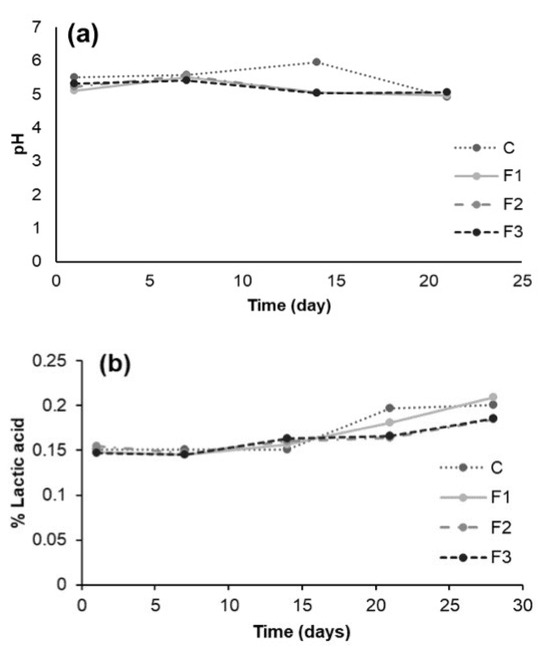 The pH values of the formulations (5.10 and 5.48) were slightly higher than those ranging between 4.62 and 5.01 [7]. In the shelf-life study (Figure 1a), the pH values ranged from 5.10 to 5.48 on day one and gradually decreased to the range from 4.97 to 5.32 during storage. According to Ziarno et al. [60], the decrease in pH is related to the consumption of lactose and the production of lactic acid and galactose, showing the metabolic activity of lactic acid bacteria during refrigerated storage. The metabolic activity of probiotic cultures leads to a pH reduction. The metabolic activity of probiotic cultures leads to a decrease in the pH of the cheese. This change influences various biochemical reactions that affect the sensory and structural characteristics of the cheese. As the pH decreases, it can alter the structure of the cheese, impacting its texture and flavor. This process is linked to the production of compounds that can modify the cheese matrix, ultimately contributing to the development of new sensory characteristics [61].