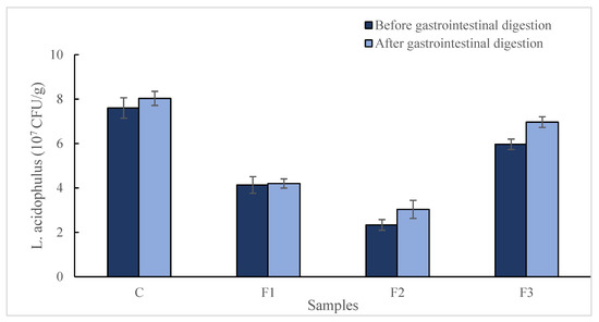 Studies have shown that L. acidophilus is sensitive to gastric acid and pepsin, presenting lower counts, as reported by Nejati et al. [71]. Schillinger et al. [72] conducted a study on six strains of L. acidophilus and verified that the number of microorganisms in the gastrointestinal-tract simulation increased.