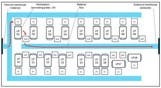 The subject of this study is production in an automatic press shop floor, where sheet metal parts [49] are produced directly for customers or for further integration into complex products. At the time of the study, the shop floor had a parallel arrangement of identical machines (job shop configuration of workstations). In Figure 1, the material flow is shown by the red line. The workstation is supplied just-in-time with electrical sheet material from the incoming warehouse. The electrical sheets of various types and dimensions are supplied on packaging units (pallets) in rolls. The packaging units are taken from the warehouse and delivered to the machine on which the specific products are produced. Normally, rotor and stator blades with different dimensions and shapes are produced. The products are placed into outgoing packaging units and boxes, which are transported by roller to the outgoing warehouse. From there, they are transported to the customer or to the company′s other production units.