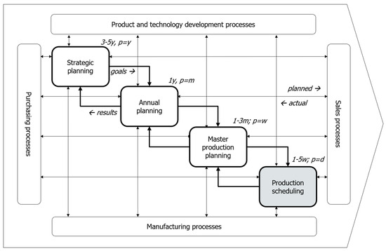 The company under observation has four hierarchically and time-organised production planning processes (Figure 2). The analysed shop floor is planned, scheduled, and timed by a single planner, who is only present during the morning shift. This study focuses on the lowest and most dynamic micro-production planning process, production scheduling, which is shaded grey in Figure 2.