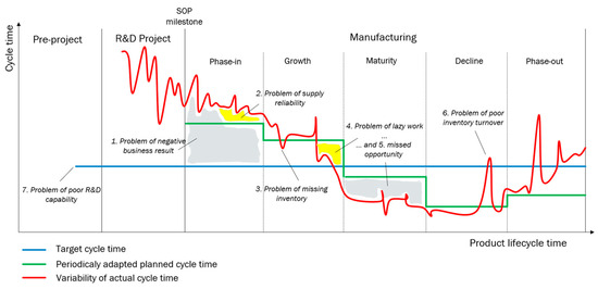 - Due to the strategic demand to bring new products to market quickly, production does not reach the target cycle at the time of phase-in. During this period, the company has a problem with a negative result (1., which is outside the planner′s control) and a problem with unreliable delivery to the customer due to unreliable production (2., which is within the planner′s control). The planner could mitigate this problem if he could predict the improvement of the cycle in the next iteration of the PO. The unreliable production at this stage is affected by unfinished material, poorly trained workers, unreliable machines, and unreliable tools. These events occur frequently and randomly, and the error between the planned and actual duration of the PO is still significant but decreases with each iteration.