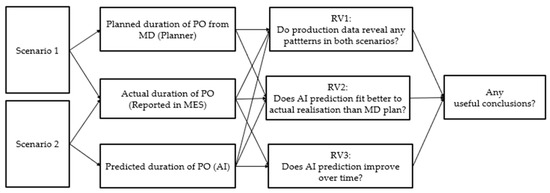 - RQ1: Does the analysis of the production data show any patterns in predicting the duration of POs based on the master data plan (hereinafter “MD plan”) and based on the AI APS prediction (hereinafter “AI prediction”) compared to the actual realisation?
