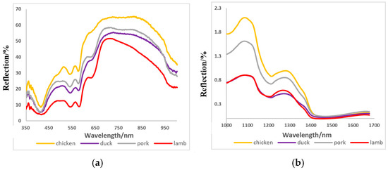 The near infrared spectra of chicken, duck, pork and lamb. (a) The near infrared spectra of chicken, duck, pork and lamb in 350–1000 nm wavelength, (b) the near infrared spectra of chicken, duck, pork and lamb in 1000–1700 nm wavelength.