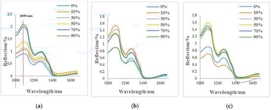 Reflectance intensities across the 350–1000 nm and 1000–1700 nm bands varied among species with a notable decrease from chicken to lamb. The minimal variations between lamb and duck/pork are attributed to species-specific pigmentation and matrix composition, which significantly influence the NIR reflectance patterns [36,37]. The relation for spectral region and chemical compound is displayed in Table 2. The NIR spectra of lamb adulterated with varying proportions of chicken, duck, and pork across two bands (350–1000 nm and 1000–1700 nm) are presented in Figure 2 and Figure 3. Reflectance ratio intensities showed a general trend of convergence toward that of the adulterating meat with the most pronounced changes observed in the 1000–1700 nm band. Species-specific myoglobin contents and protein compositions contribute to the distinct NIR reflectance patterns with less pronounced correlations observed for duck and pork adulteration in the 1000–1700 nm band compared to chicken [38,39]. Notably, the 1080 nm peak, associated with N-H bonds, showed pronounced changes with varying adulteration levels, highlighting protein composition discrepancies between species, which is the same as the findings of Kademi et al. [40].