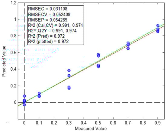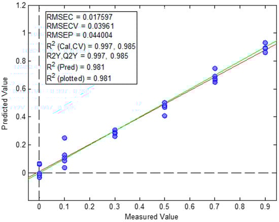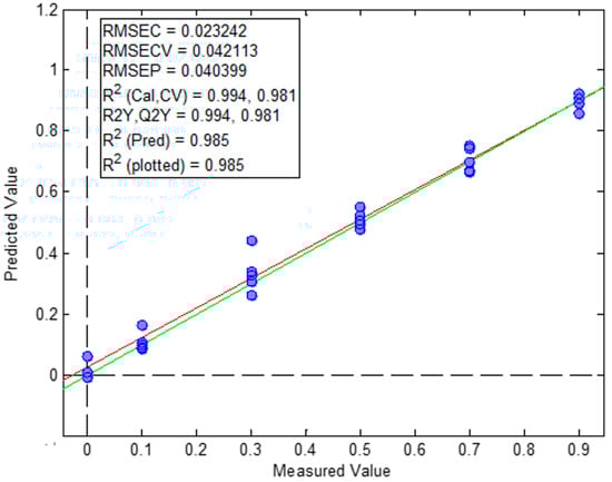 In the quantitative models, RMSECV typically decreases as the number of principal factors increases, which is followed by a slight increase and then a continued decrease. The fluctuation in RMSECV later on is attributed to the inclusion of background noise in the modeling due to the addition of more principal factors, which is undesirable even if the fitting effect is satisfactory [41]. Therefore, the minimum RMSECV value observed during the first reduction is chosen as the optimal number of principal factors. By comparing the best principal factor models derived from different pretreatment methods, the optimal quantitative model can be obtained. For the quantitative prediction model of lamb mixed with varying proportions of chicken, the combination of the first derivative and Standard Normal Variate (SNV) preprocessing is employed. The correlation coefficients (R2c and R2p) for the calibration and prediction sets are 0.991 and 0.972, respectively. The root mean square errors for the calibration set, prediction set, and cross-validation set are 0.031, 0.054, and 0.052, respectively (Figure 4). Similarly, for the model of lamb mixed with varying proportions of duck, SNV preprocessing is used. The R2c and R2p for the calibration and verification sets are 0.994 and 0.985, respectively, with RMSEC, RMSEP, and RMSECV values of 0.023, 0.040, and 0.042, respectively (Figure 5). The pork adulteration quantitative model utilizes the MSC method, yielding R2c and R2p values of 0.997 and 0.981 for the calibration and verification sets, respectively, with RMSEC, RMSEP, and RMSECV values of 0.018, 0.044, and 0.040, respectively (Figure 6). These three adulteration quantitative models exhibit high accuracy and stability, demonstrating good prediction capabilities for adulteration in unknown samples.