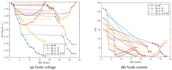 As presented in Figure 2b, the power flow direction of the distribution system changes at nodes 18 and 33 after the DG connection. Therefore, the current direction at nodes 7–18 and 26–30 is opposite to that without the DG connection. It can be observed that the current level of nodes 1–7 decreased significantly after DG was connected, while nodes 19–22 and 23–25 were almost unaffected. Moreover, when nodes 18 and 33 are simultaneously connected to the DG, the penetration rate of the DG is further improved. Compared to connecting a single DG, the current level of upstream nodes at the connection location is further reduced.