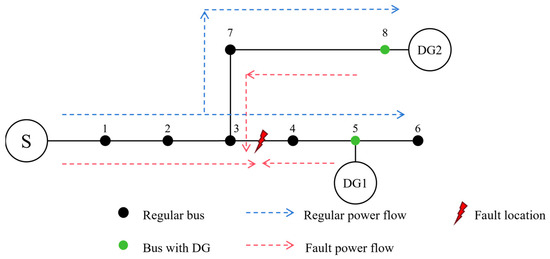 When a short-circuit fault occurs in the traditional distribution network, the current will significantly increase. However, when the DG is connected to the grid, the direction of the distribution network flow will change, and the fault current will also change accordingly. Figure 3 shows the variation of power flow in the distribution network after connecting to the DG, which depends on factors such as the location and capacity of the DG connection, as well as the distance from the fault point.