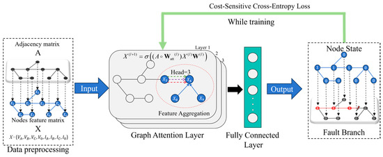 The problem of fault location in distribution networks can be seen as a fault state classification problem, which distinguishes whether different nodes are in a fault state or in a normal operating state. GCN can combine the graph information of the distribution network topology and the electrical information of each node to determine each node state, thereby achieving accurate fault localization. Unlike the GCN, the GAT can utilize attention mechanisms to pay more attention to neighbor nodes, which is more suitable for the distribution network branch and the node changes. The fault location model based on the graph attention network proposed in this study is shown in Figure 4.