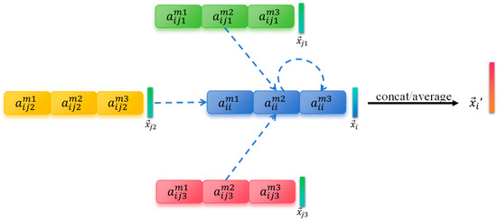 where the represents the number of attention heads, || represents the concatenation operation, and and represent the attention mechanism matrix and weight matrix of the -th head, respectively. In the GAT middle layer, the concatenation operations are generally worked to improve the expression ability of the attention layer, but the last layer of the GAT often utilizes averaging operations to avoid feature dimension expansion caused by concatenation operations.