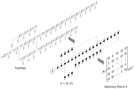 Adjacency matrix stores graph structure information in the form of a two-dimensional array. Constructing adjacency matrix is a very important part of the GAT, and it is also the key difference between the GAT and the general neural network. The topology of the distribution network has natural graph structure information. From the perspective of graph theory, the devices in the distribution network can be abstracted as nodes, and the connection relationship between devices can be abstracted as edges. In practical applications, the devices that can monitor distribution network information are often regarded as nodes of the network topology, and the connection relationship between monitoring devices is regarded as edges of the topology to obtain a graph . Then the graph relationship is further transformed into the adjacency matrix , as shown in Figure 7.