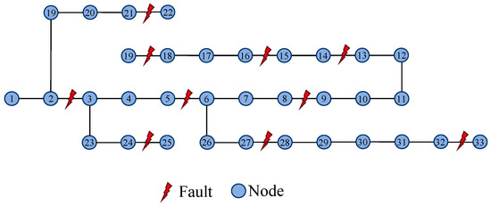 As shown in Figure 9, ten branches (such as 2, 5, 8, 13, 15, 18, 21, 24, 27, 32) are researched, and simulate the single-phase ground fault occurring in each of the three phases A, B, and C of each branch, respectively, with fault resistance ranging from 50 Ω to 200 Ω. Within 0.2 s after the fault, the voltage and current amplitudes of each node and the zero-sequence voltage and current amplitudes are taken to form the node characteristic data X, with a dimension of (33, 8). Each branch is simulated 100 times for each phase fault situation, totaling 3000 sets of fault characteristic data. While obtaining the feature matrices of each node, the graph structure data G of the distribution network topology and the associated fault labels T are recorded, together forming a single fault data entry. Since the proportion of fault data in reality are small, when constructing the dataset, normal operation and fault conditions are simulated and summarized at a ratio of 9:1. Finally, the dataset is divided into training, validation, and testing sets at a ratio of 8:1:1.