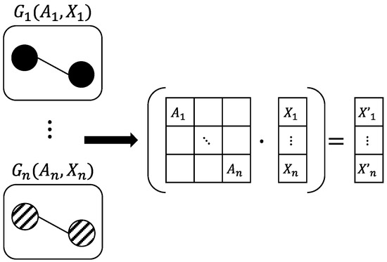In neural network training, it is common to use batch-size to process or feed multiple sets of data into the network simultaneously, to improve training efficiency and the model’s generalization capability. Figure 10 illustrates the batch training method in GNN. When multiple sets of data are trained together, the adjacency matrices of individual graphs are concatenated diagonally to form a larger, sparser adjacency matrix. If traditional two-dimensional arrays are still used for storage and computation, this would lead to significant resource waste and performance bottlenecks. Therefore, under the context of handling large-scale graph data, adopting efficient compression storage and computation techniques becomes particularly critical to reduce memory usage and enhance processing speed.