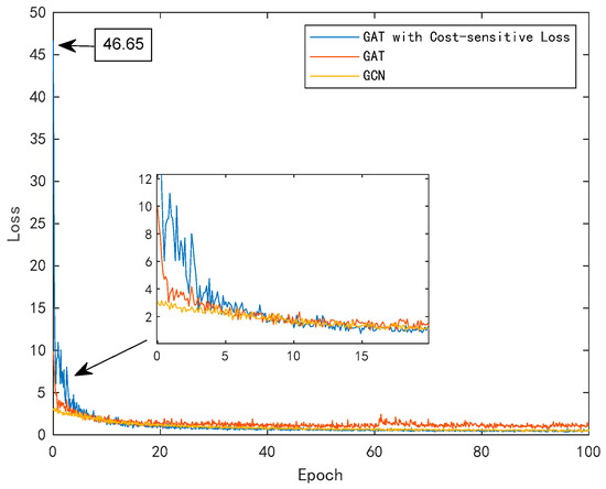 Based on the MATLAB 2023a platform, the GCN [27] and GAT [25] based models were reproduced, and a comparative analysis was conducted on the fault localization performance against the proposed method. Figure 11 exhibits the training loss of the proposed method and comprehensively compares GCN and GAT. Due to imbalanced datasets, there are many misclassifications during the initial training phase. However, as the number of training sessions increases, the GAT with cost-sensitive losses learns node features and topological relationships faster, and the loss value decreases rapidly. Traditional GAT is more affected by non-fault data in imbalanced datasets, which leads to lower overall prediction accuracy and is more prone to loss fluctuations and overfitting during training.